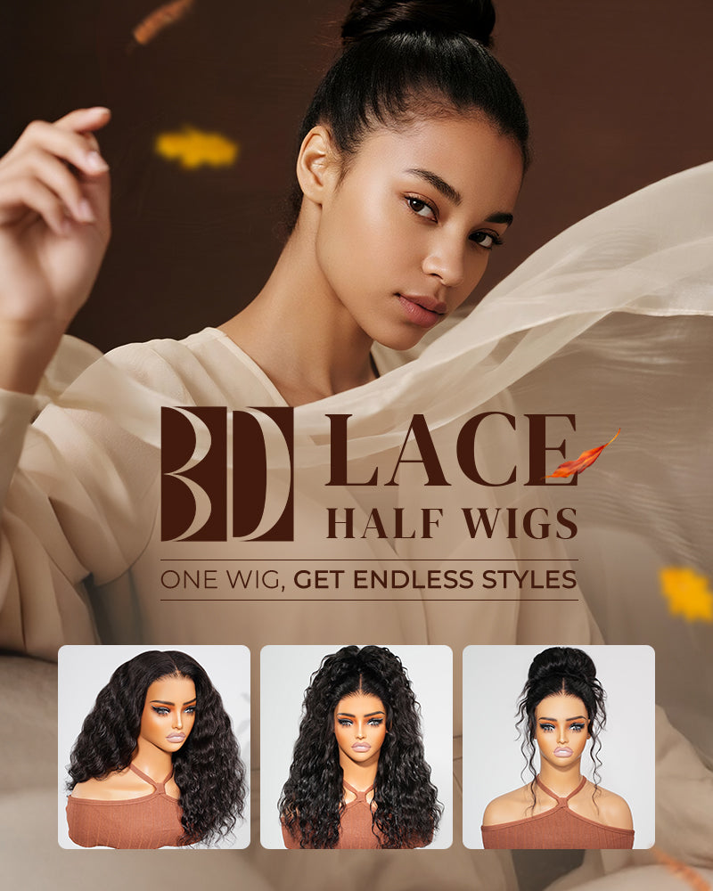 Arabella 3D Lace Half Wig Water Wave With Finger Coil Ends Wig Natural Black Breathable & Security3D Lace Half Wig Water Wave With Finger Coil Ends Wig Natural Black Breathable & Security