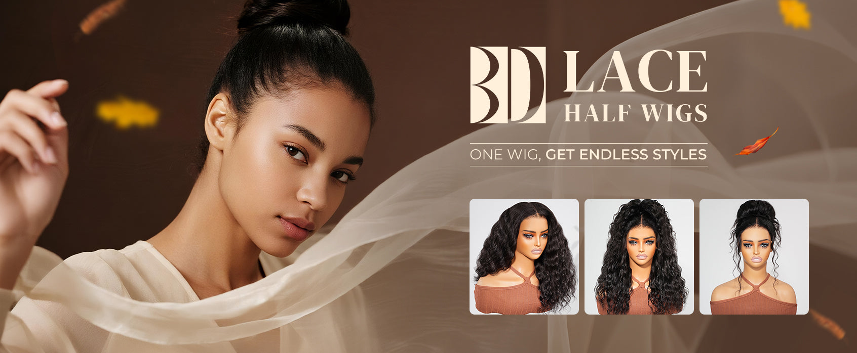 Arabella 3D Lace Half Wig Bohemian Curl Wig Natural Black Breathable & Security3D Lace Half Wig Bohemian Curl Wig Natural Black Breathable & Security