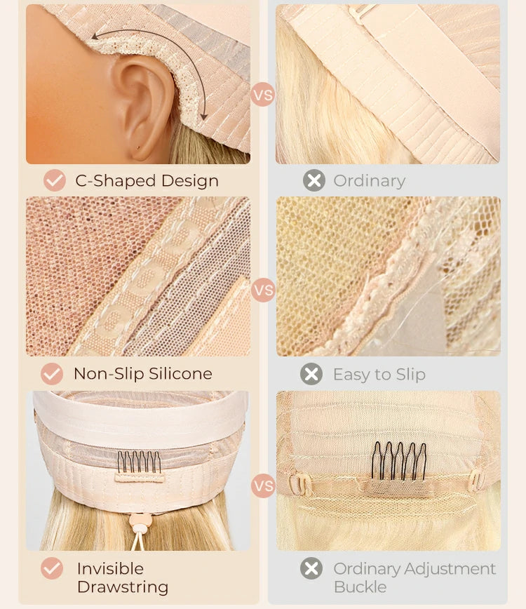 A: Our 6x5 and 13x6 wigs feature a glueless design with adjustable straps, combs, and a drawstring for a natural fit, allowing you to wear it easily, wear to go! While 13x4 lace wigs are usually installed with glue or adhesive for a secure fit.