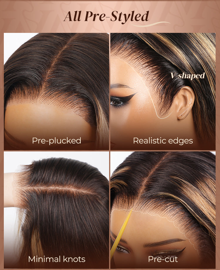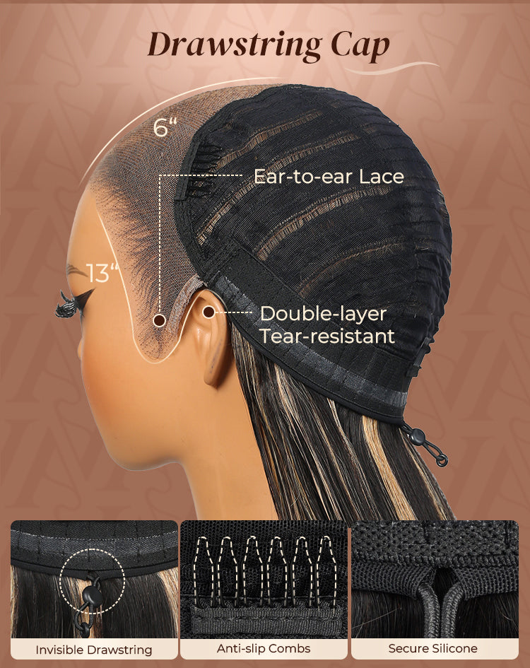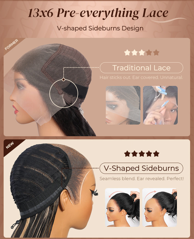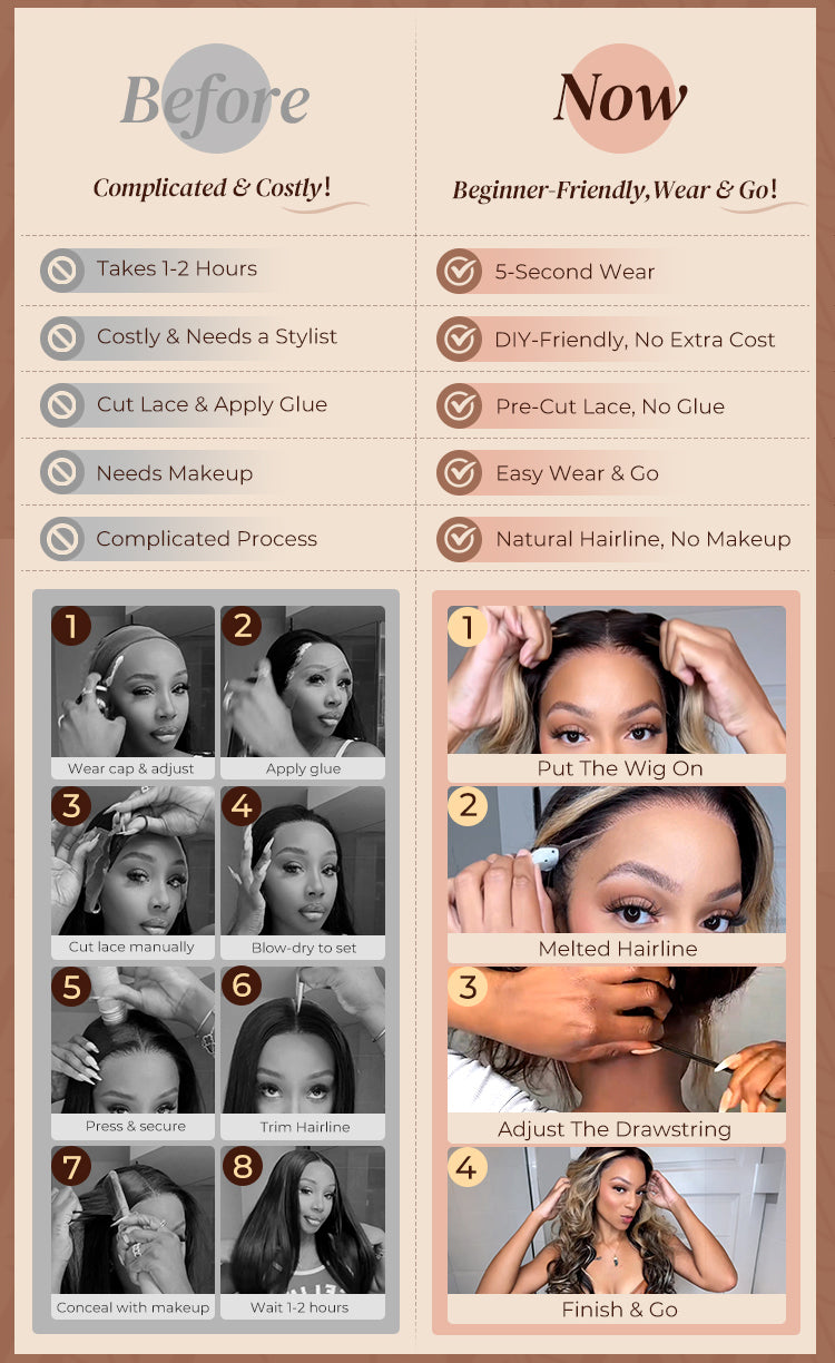 A: Our 6x5 and 13x6 wigs feature a glueless design with adjustable straps, combs, and a drawstring for a natural fit, allowing you to wear it easily, wear to go! While 13x4 lace wigs are usually installed with glue or adhesive for a secure fit.