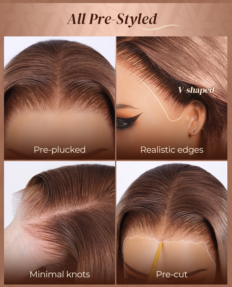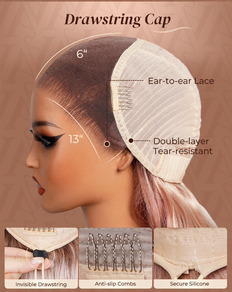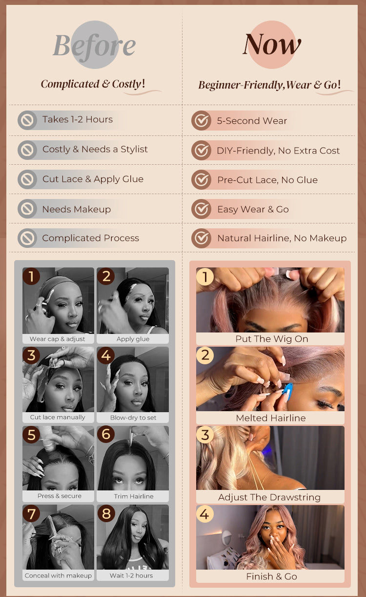 A: Our 6x5 and 13x6 wigs feature a glueless design with adjustable straps, combs, and a drawstring for a natural fit, allowing you to wear it easily, wear to go! While 13x4 lace wigs are usually installed with glue or adhesive for a secure fit.